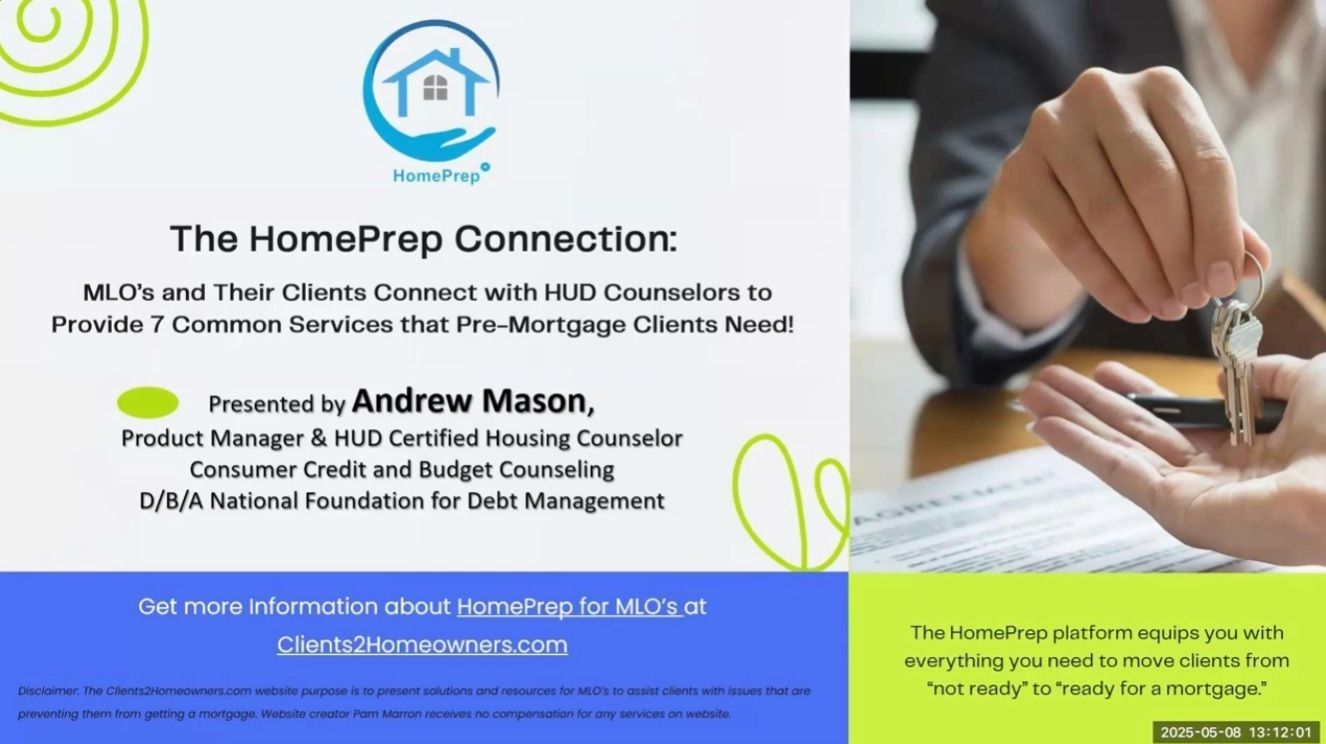 HomePrep provides 7 services for pre-mortgage clientsis a professional service designed to help Mortgage Loan Originators (MLOs) support clients who are not yet mortgage-ready due to credit issues, student loan debt, need for down payment assistance, budgeting help and other qualifying obstacles. Through a streamlined partnership with a certified HUD housing counselor, HomePrep connects these clients to tailored pre-mortgage readiness services—giving MLOs a reliable, trackable path to help more borrowers become eligible for home financing.