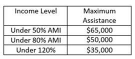 Example using Pasco County Down Payment Assistance: a 30 yr old mother's income for her and 3 children ages 6,8 and 9 is $68,450. This family of 4 is below 80% AMI (HUD income levels) and qualifies for $50,000 of down payment assistance per table on the left.